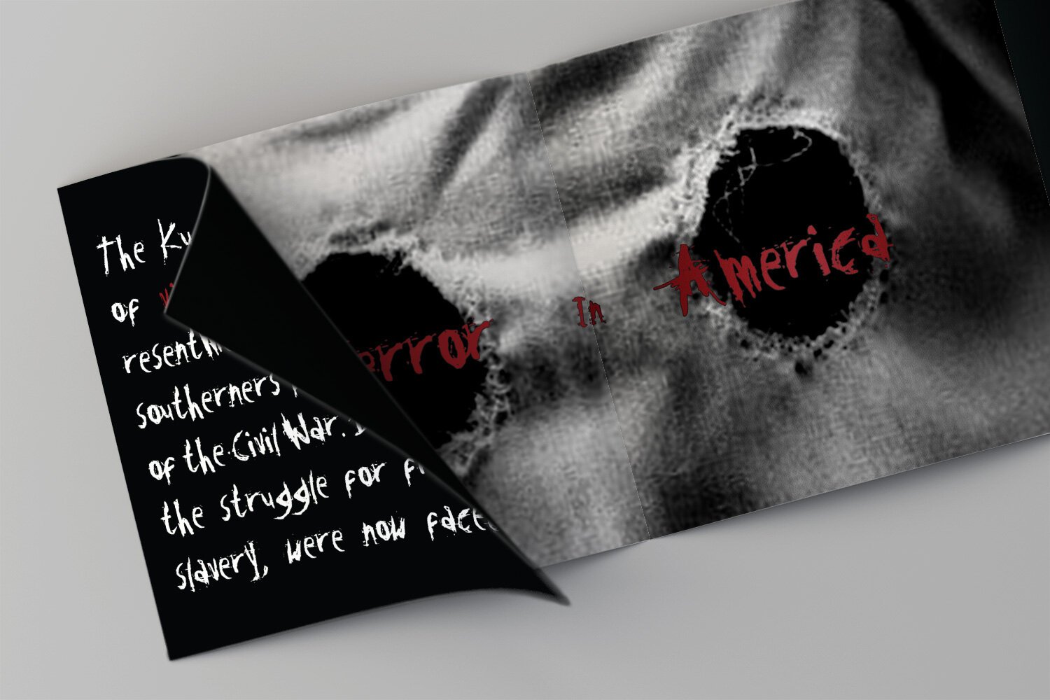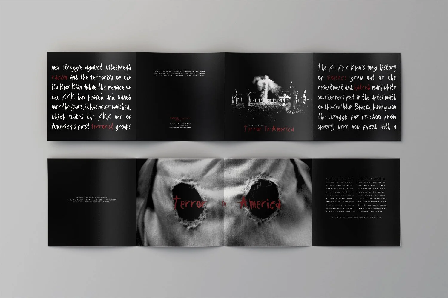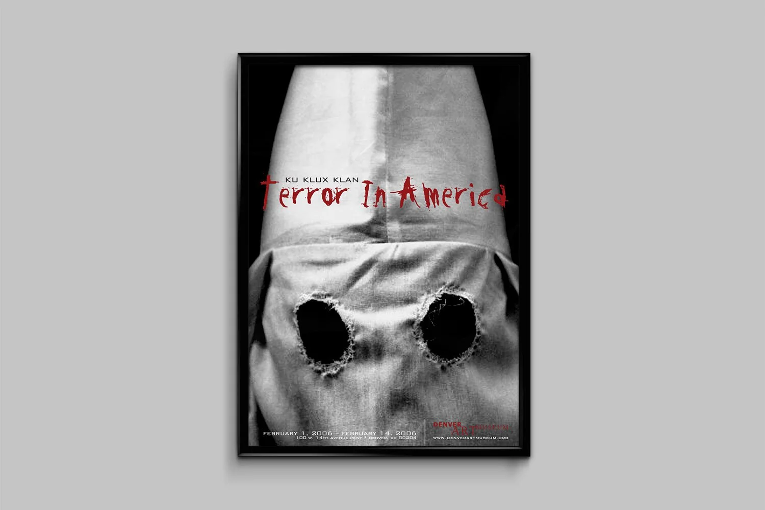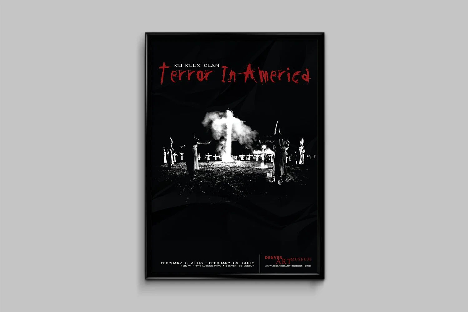 Denver Art Museum | SCAD Case StudyThe Ku Klux Klan: Terror In America Museum Exhibit presented a visual time line of the history of the KKK and how it relates as a terrorist group in America. The concept promotional campaign was imagined for the Denver Art Museum and made up of a selection of posters, a brochure, and a variety of mailing postcards.
