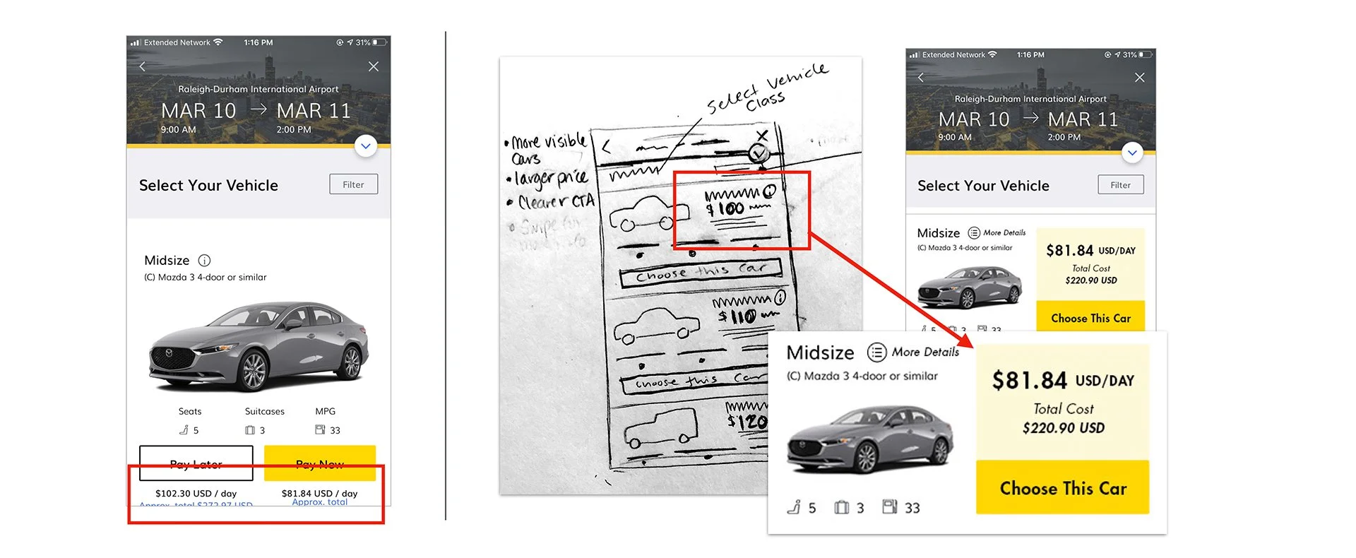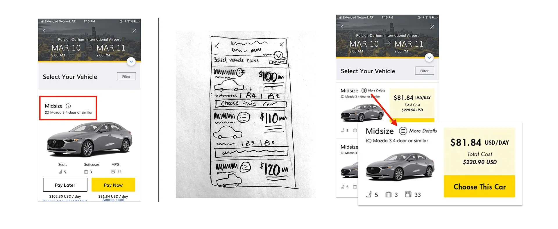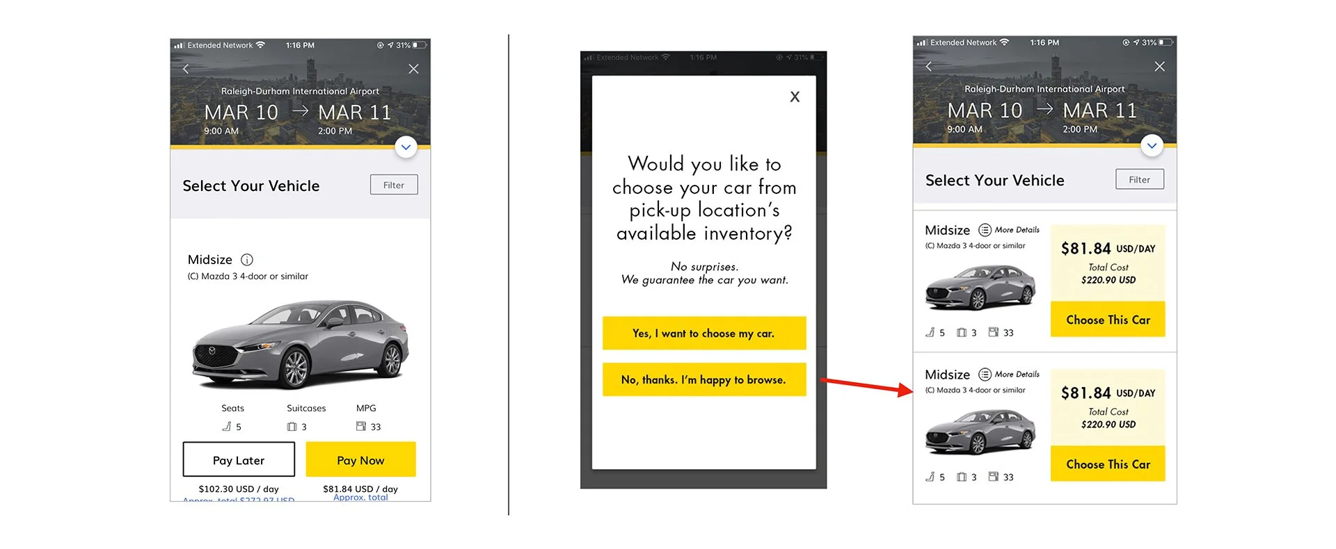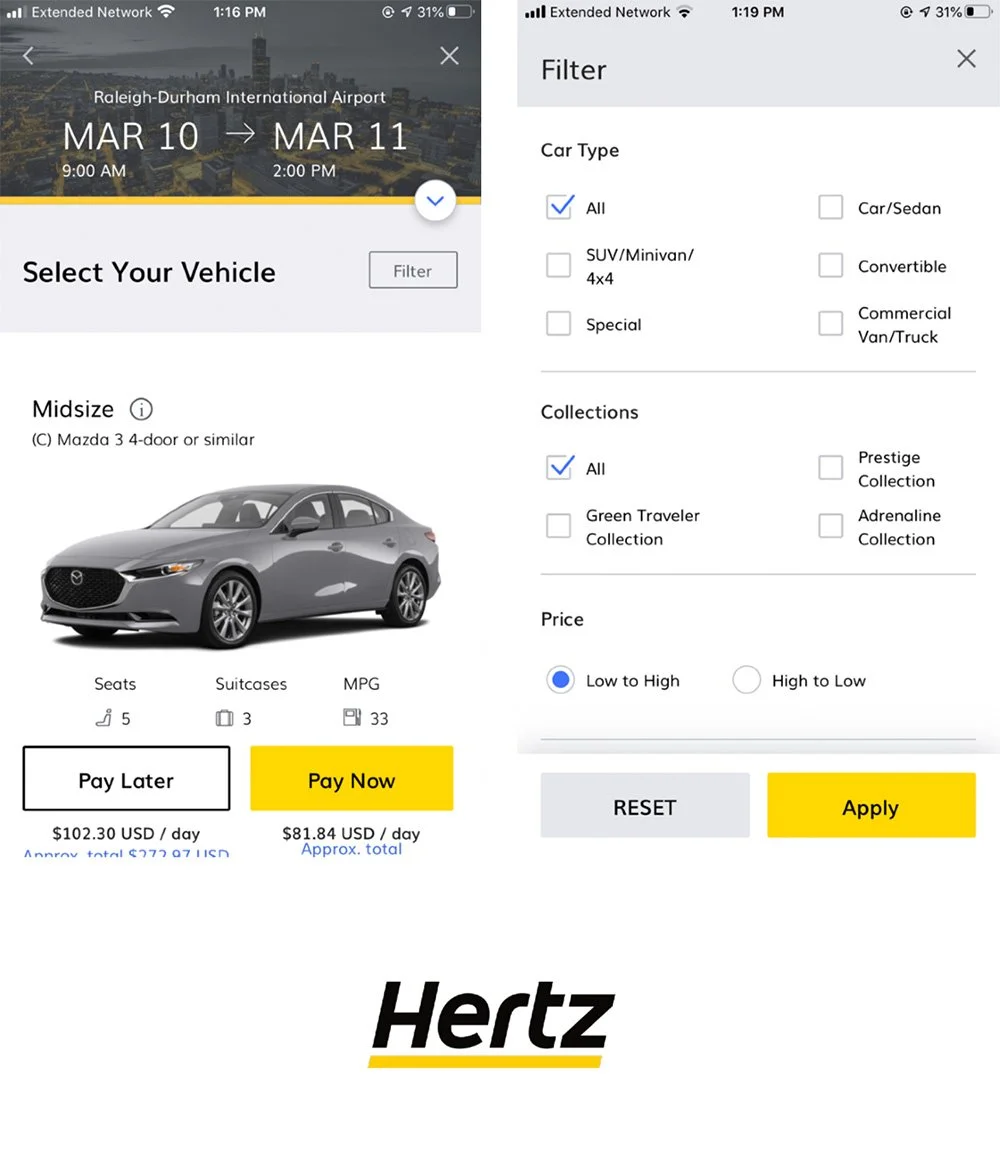 Design a better way for a mid-career professional who occasionally travels for work to find just the right vehicle when using the hertz mobile app.