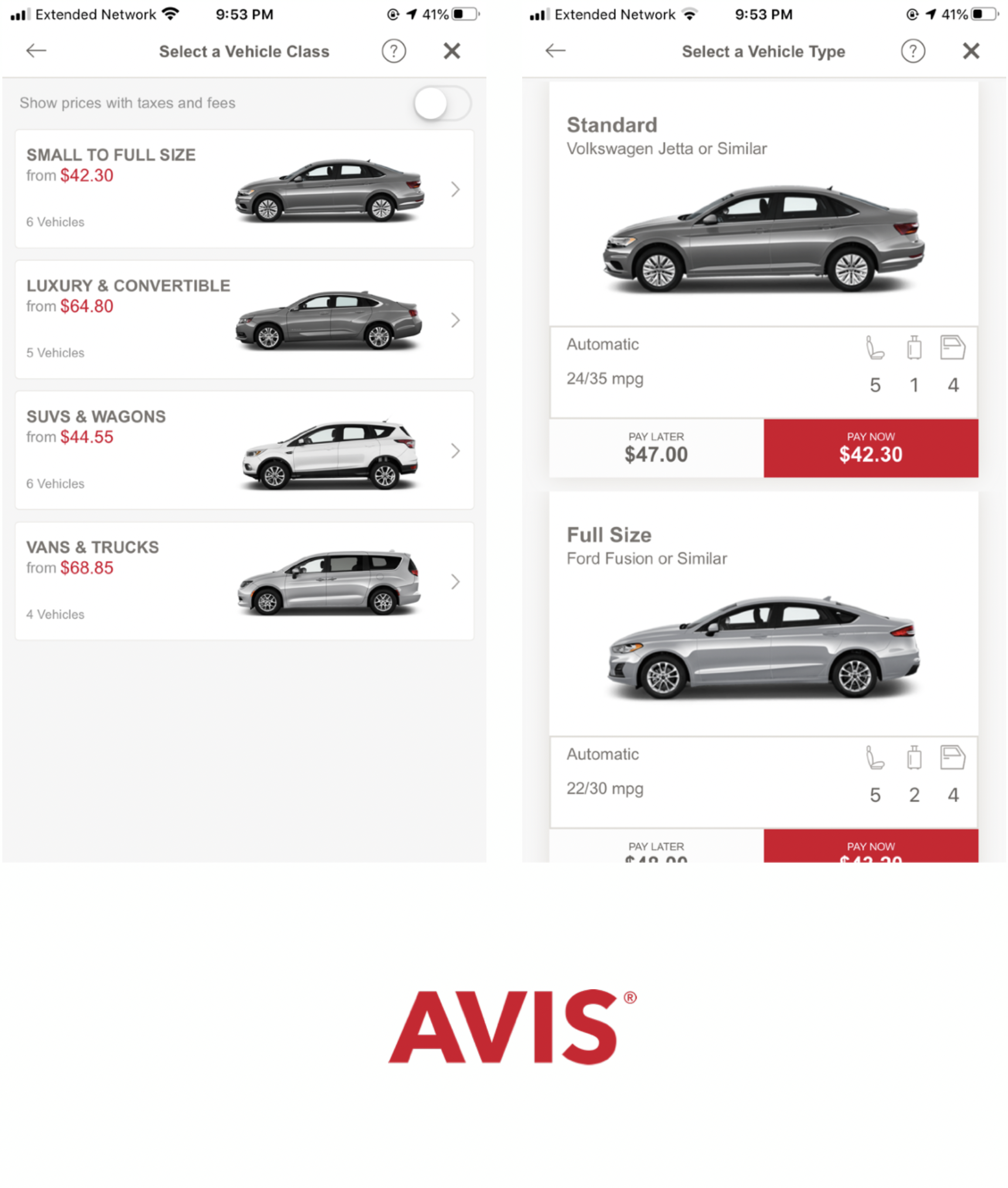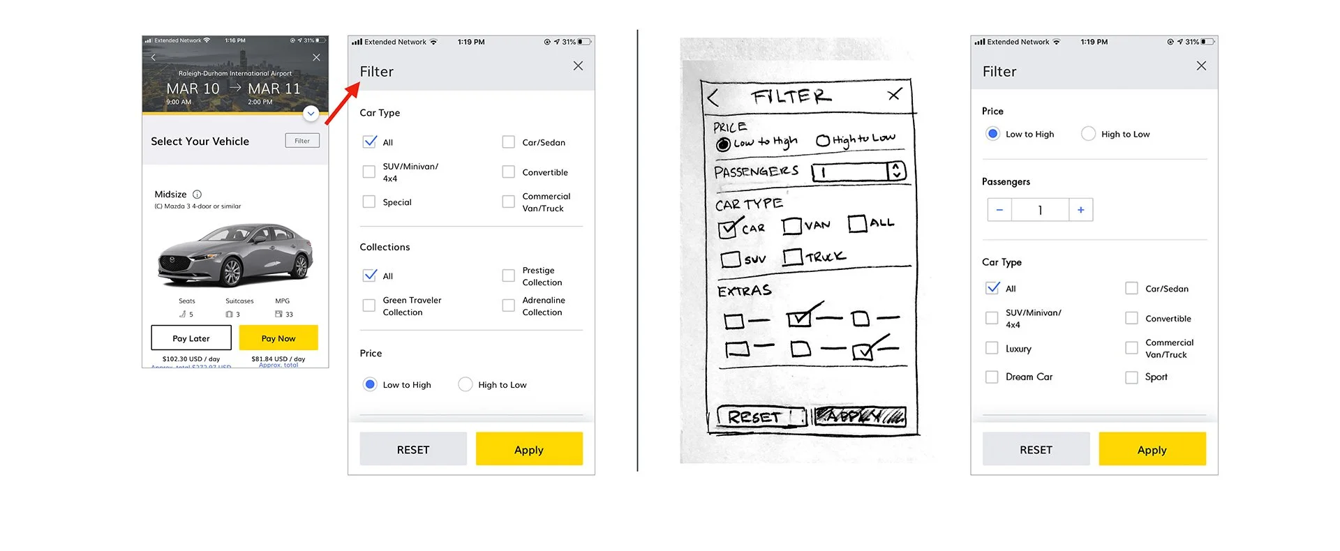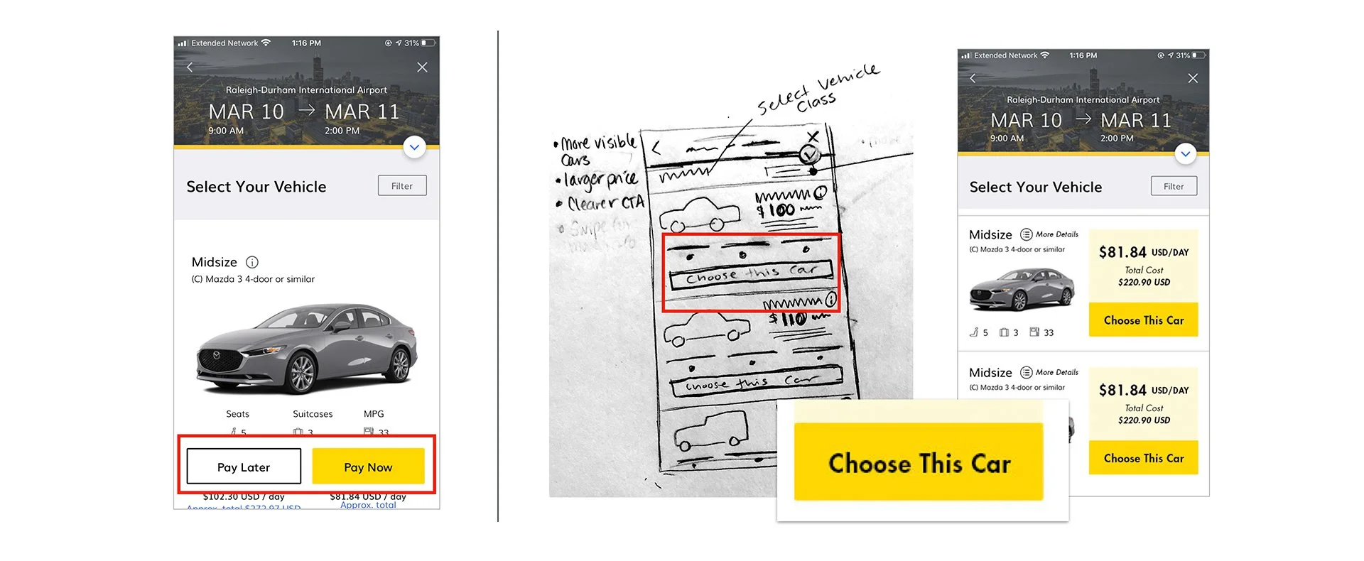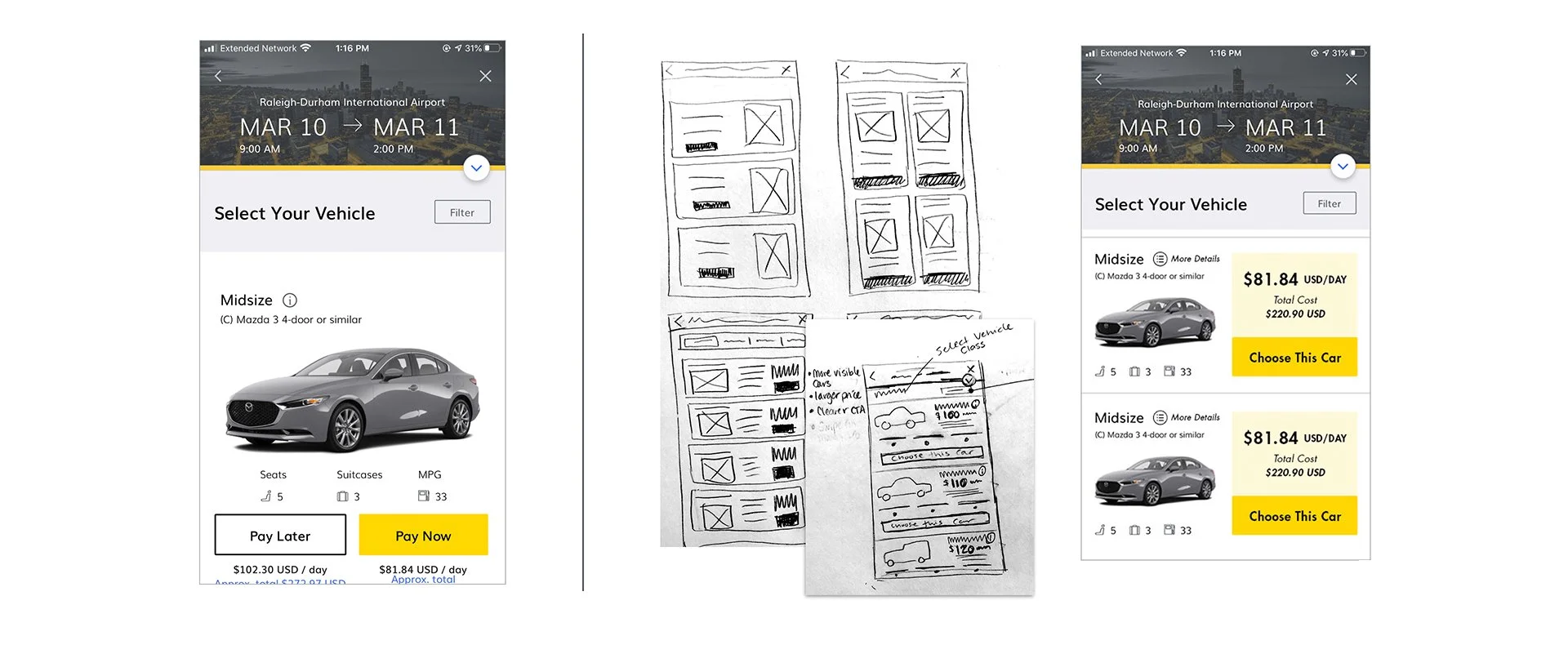 Design a better way for a mid-career professional who occasionally travels for work to find just the right vehicle when using the hertz mobile app.